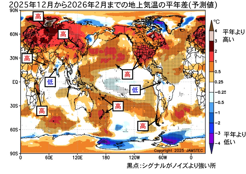 SINTEX-Fの季節予測によると、今年の12月から来年の2月は、世界の多くの地域で気温が平年より高くなりますが、南米北部やインドの一部の地域では気温が平年より低くなる見込みです。