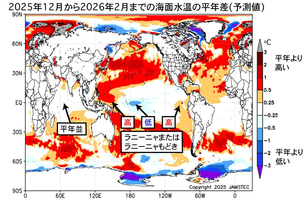 SINTEX-Fの予測によると、今年の12月から来年の2月まで太平洋の熱帯域は、中央部で海水温が平年より低く、西部で高くなるラニーニャ現象、または東部と西部で高くなるラニーニャもどき現象が成熟する見込みです(図3)。一方、インド洋の熱帯域は、海水温が平年並みとなる見込みです。