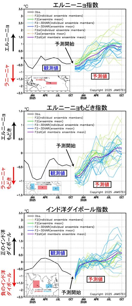 一方、インド洋の海水温の変動ですが、インド洋ダイポール指数を見ると(図4下段)、11月に負のインド洋ダイポール現象がピークに達しますが、その後、減衰して、冬には平年並みに戻る見込みです。ただし、予測値(24個のカラー線)の振幅にばらつきが見られるため、今後の情報に注意されてください。こうした傾向は、他の一部の研究機関の予測結果でも見られています。