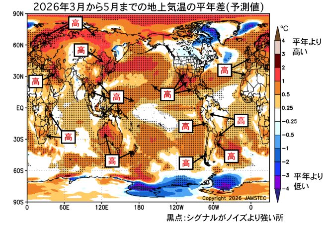 SINTEX-Fの季節予測によると、今年の3月から5月は、世界の多くの地域で気温が平年より高くなる見込みです。