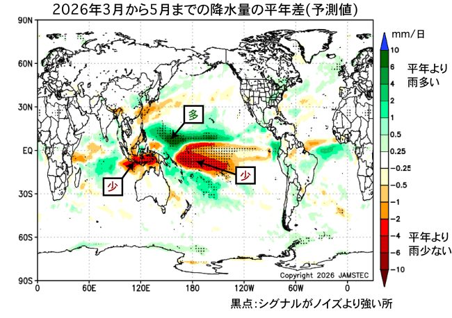 また、日本は多くの地域で気温が平年より高く、沖縄の周辺では雨が少なくなる見込みです。ただし、中高緯度の予測精度には限界がありますので、今後の情報に十分に注意されてください。