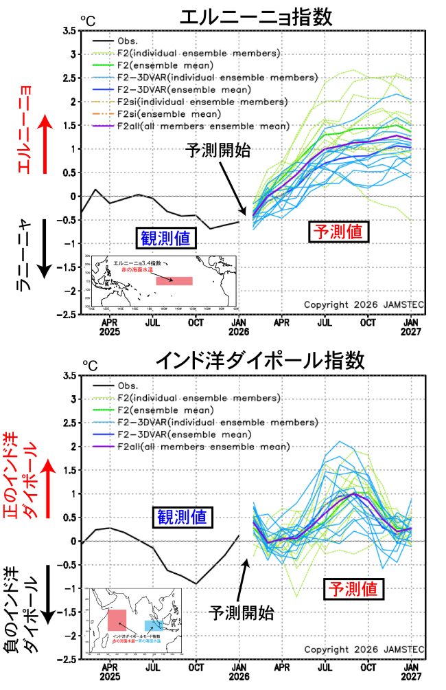 一方、インド洋の海水温の変動ですが、インド洋ダイポール指数を見ると(図4下段)、春まで平年並みの状況が続き、その後、夏の半ばに正のインド洋ダイポール現象に遷移する見込みです。ただし、予測値(24個のカラー線)の振幅にばらつきが見られるため、今後の情報に注意されてください。こうした傾向は、他の一部の研究機関の予測結果でも見られています。