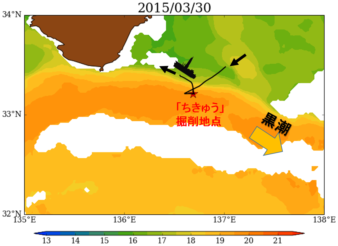 「ちきゅう」の観測が始まりました(※1)。「ちきゅう」から海流の観測データが送られてきたので、今回はそのデータを見てみましょう。 図1の色は、気象衛星「ひまわり8号」からJAXAが作成した3月30日の海面水温の分布です( … 続きを読む