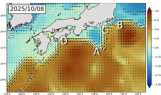 一方で、黒潮大蛇行からちぎれていた渦は、黒潮に吸収されて別の蛇行をつくっています(図1, A”)。この蛇行は東に移動し、潮岬から黒潮が離岸しています。
