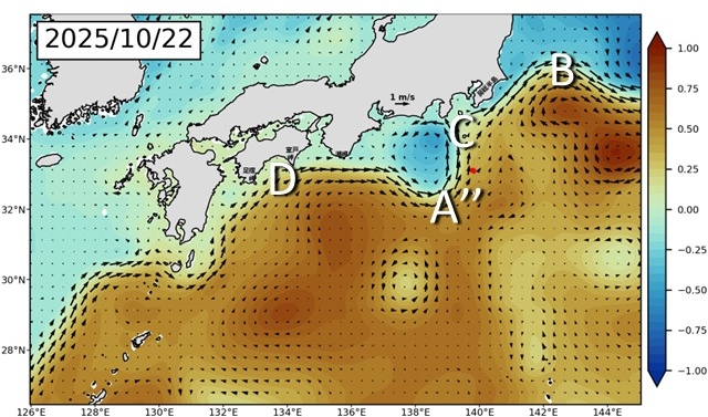 一方で、黒潮大蛇行からちぎれていた渦は、黒潮に吸収されて別の蛇行をつくっています(図1, A”)。