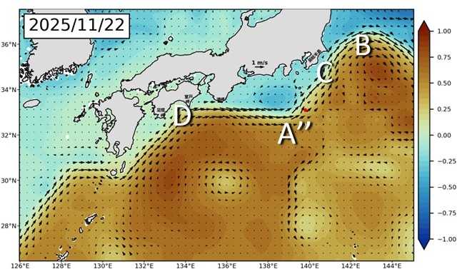 西の蛇行(A”)は大きい蛇行が保たれ、大蛇行的な流路になる可能性があります(図2)。蛇行が大きいまま、潮岬での離岸が続けば大蛇行になりますが、観測に接岸の兆候があらわれています(図4参照)。予測では、蛇行もやや小さく潮岬に接岸しそうですが(図3)、まだ先なので予測が変わってくる可能性があります。