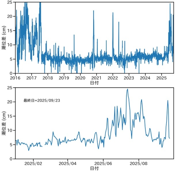 図4: [上]串本・浦神の潮位差(日平均)の2016年1月1日以降の時系列。データは気象庁から入手した。[下] 2025年以降を拡大。