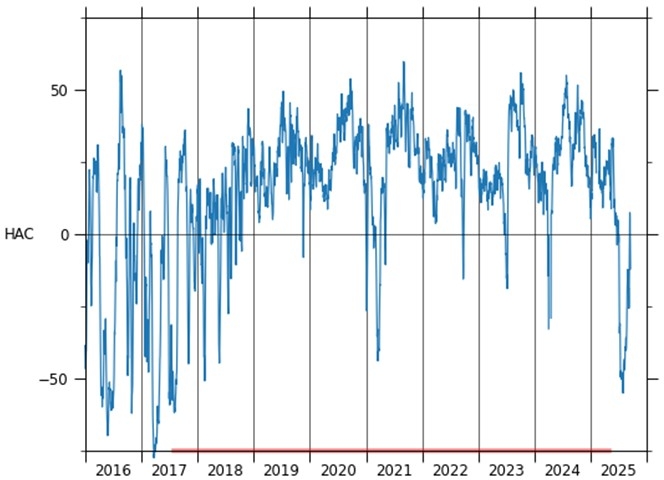 図5: 東京大学大気海洋研究所「潮位データを用いた黒潮モニタリング」の「各潮位データの図示」から、「期間: 2025年までの 10年間」・「八丈島」でグラフ作成。単位はセンチメートル。