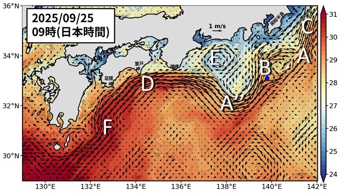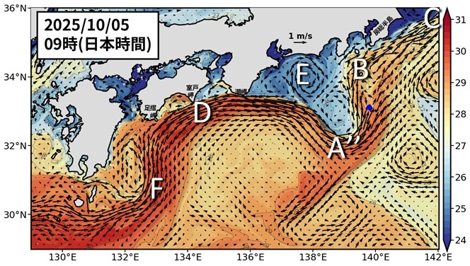 気象庁と海上保安庁は今回の黒潮大蛇行が2025年4月に終息したとの判断を発表しています(2025/8/29発表)。しかし黒潮大蛇行の余波は続いています(「2025年の黒潮のこれまでをふりかえる」参照)。房総付近で蛇行があるのと同時に(図1A)、黒潮からちぎれていた渦が吸収される形で東海沖にも蛇行があります(図1 A”)。