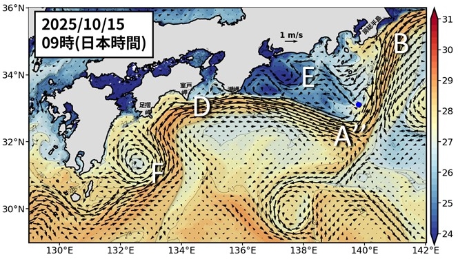 黒潮は八丈島をはさむようにして流れています(図1, B。図5も参照。)。蛇行A”の東進の影響を受けて、北に暖水渦が存在しています(図1 E)。四国から紀伊半島にかけて黒潮が近づいています(D)。
