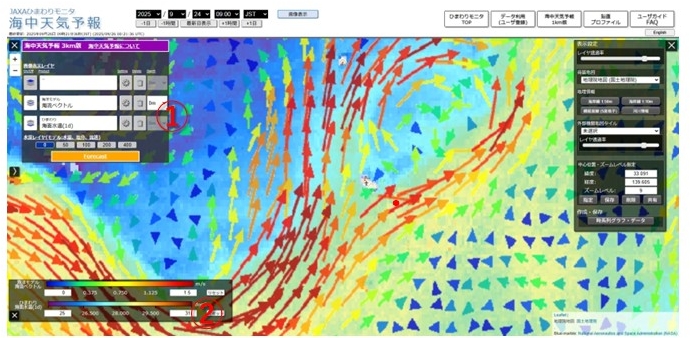図5:2025年9月24日のー日平均の人工衛星「ひまわり」観測の海面水温(色)(①で指定)とモデルによる流れの推測値(矢印)(①で指定)。水温の色の範囲を25~31度とした(②で指定)。同図へのリンク。