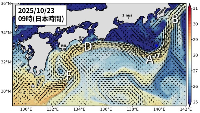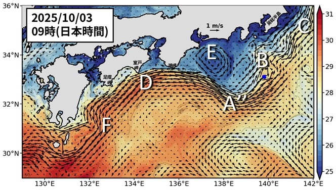 気象庁と海上保安庁は、黒潮大蛇行が2025年4月に終息したとの判断を発表しています(2025/8/29発表)。しかし黒潮大蛇行の余波は続いています(「2025年の黒潮のこれまでをふりかえる」参照)。黒潮からちぎれていた渦が吸収される形で、東海沖に蛇行があります(図1 A”)。