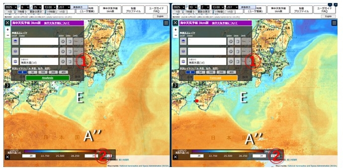 図5はJAXAひまわりモニタ・海中天気予報のサイトで見た、人工衛星「ひまわり」で観測された9月25日(左)と10月2日(右)の海面水温です。