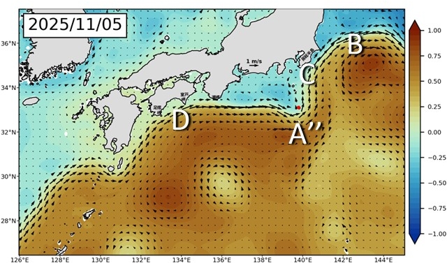 黒潮大蛇行からちぎれていた渦は、黒潮に吸収されて蛇行をつくっています(図1, A”)。