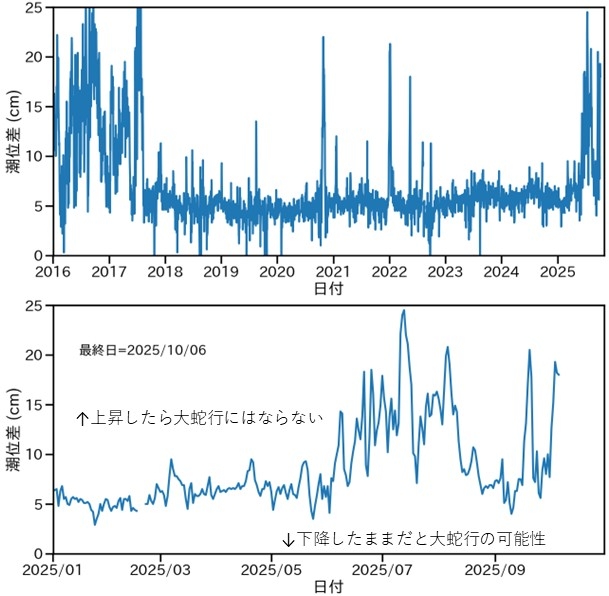 黒潮大蛇行の特徴のもう一つの特徴は、黒潮が八丈島の北を通ることです。八丈島の南を黒潮を通ると、八丈島の潮位が下がることが知られています(「黒潮が八丈島の南を流れているのをどうやって観測で確認するの?」参照)。八丈島の潮位は、東京大学大気海洋研究所の藤尾伸三准教授のウェブサイト「潮位データを用いた黒潮モニタリング」で見ることができます。図5は、このサイトから八丈島での潮位のこの10年の変化をグラフ作成したものです。黒潮大蛇行が始まって以来、短期間を除き、八丈島の潮位は高い状態が続いてきました。大蛇行が終息した後、潮位は低下しました。その後、ある程度上昇しましたが、直近のデータは再び下降に転じています。これも黒潮大蛇行にならない兆候です。