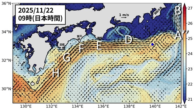 潮岬では接岸が続き(E)、室戸岬では接岸し、足摺岬(G)・九州東(H)ではやや離岸するという予測です(図2~3)。