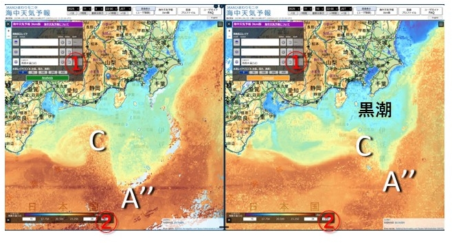 南端が八丈島の東にあった蛇行(左, A”)は八丈島の東に移動しています。先週の記事で紹介した分岐流Cは八丈島付近に移動しています。結果、黒潮は八丈島の南(左)から近く(右)になっています。