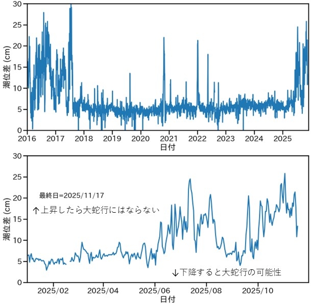 黒潮大蛇行の特徴の一つは、黒潮が潮岬で離れていることです。黒潮が潮岬で離れているかを観測で見る良い方法として、串本と浦神の潮位差を見るという方法が知られています(「潮岬への黒潮接岸判定法は?: 串本・浦神の潮位差」参照)。黒潮が紀伊半島に近づくと潮位差は大きくなり、黒潮が紀伊半島から離れると潮位差は小さくなります。2017年に黒潮大蛇行が始まって以来、一時を除いて小さな値が続いていました(図5)。しかし、4月の黒潮大蛇行の終息後しばらくして値が大きくなり、潮岬で黒潮が接岸しました。その後、西の蛇行(A”)による離岸によって、串本と浦神の潮位差は再び小さくなりましたが、再び上昇が見られています。黒潮が潮岬に接岸している証拠となります。予測通りであれば、今後も黒潮は潮岬に接岸し、潮位差は大きい値が続きます。