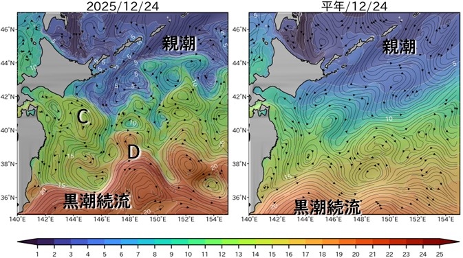 図1左はJCOPE3Mによる水深10メートルでの、11月23日の水温(色、℃)と流れ(矢印)です。右が同じ日の平年の値です[1]。
