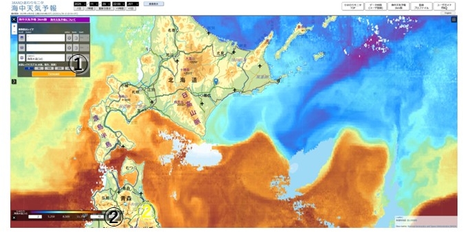 JAXAひまわりモニタ・海中天気予報のサイト (解説は「JAXAひまわりモニタ・海中天気予報のサイトがリニューアル」) 。このサイトでは上の予測(JCOPE2M, 約9kmメッシュ)よりも高分解能のモデル(JCOPE-T 1ks 約1kmやJCOPE-T DA 約3km)の様々な図を見ることができます。モデルの結果と人工衛星「ひまわり」の図を重ねることもできます。