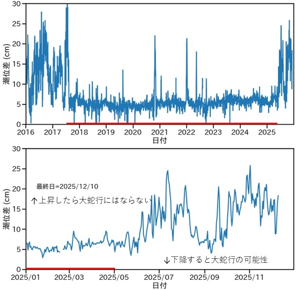 八丈島の南を黒潮が通ると、八丈島の潮位が下がることが知られています(「黒潮が八丈島の南を流れているのをどうやって観測で確認するの?」参照)。現在、値は大きくなっており、黒潮が八丈島の北を流れている証拠になります。測通りであれば、潮位は大きい値が続きます。