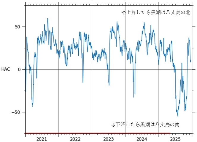 八丈島の南を黒潮が通ると、八丈島の潮位が下がることが知られています(「黒潮が八丈島の南を流れているのをどうやって観測で確認するの?」参照)。現在、値は大きくなっており、黒潮が八丈島の北を流れている証拠になりますが、やや下降しており、黒潮が八丈島に近づいていることをしめしています。予測通りであれば、一時的に潮位がさらに低下します。