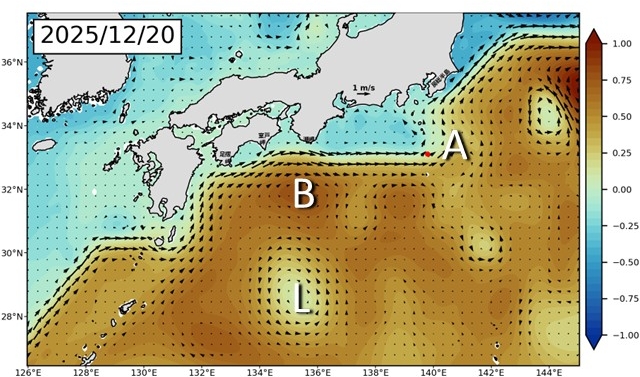 今後の予測のもう一つの注目点は、冷水渦Lです。この渦は西に移動すると予測しています(図1~3)。冷水渦Lがこのまま西に進んで九州南東の黒潮に近づくと、小蛇行を引き出し(図3 C)、黒潮の流れが変化するきっかけになる可能性があります。