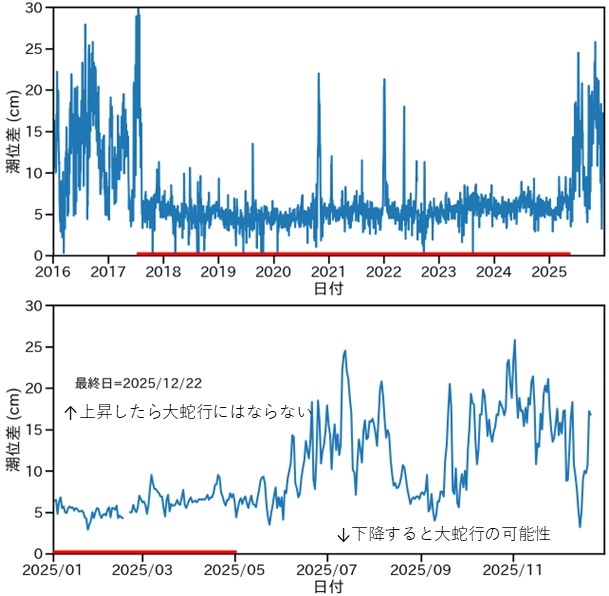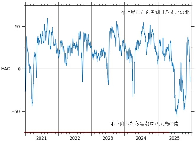 八丈島の南を黒潮が通ると、八丈島の潮位が下がることが知られています(「黒潮が八丈島の南を流れているのをどうやって観測で確認するの?」参照)。現在は値が下降しており、黒潮が八丈島に近づいていることをしめしています。予測通りであればこの下降は一時的で、下降の後に上昇します。
