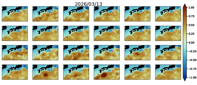 JCOPEでは、上記の予測の他に、予測初期での条件を変えて予測がどれくらいの幅で変わるかという予測実験も行っています(JCOPE3Fによるアンサンブル予測)。下の参考図は2026年3月13日の黒潮の予測です。全24の予測をおこなっています。先週よりも黒潮が八丈島(●)の南を流れる予測が増えています。図1~3で注目している冷水渦Lの動きは予測により様々で、不確実性が大きいです。