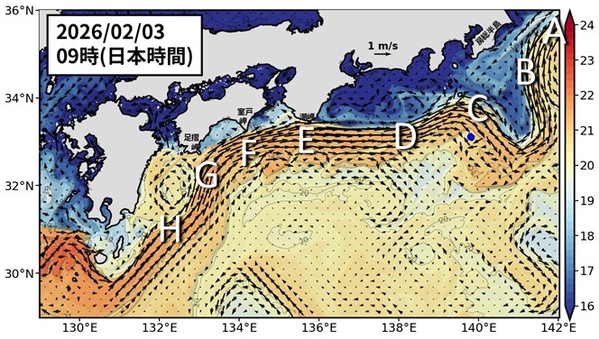 黒潮の沿岸側には、西向き(B)や北西向き(D)の暖水の分岐が見られます。