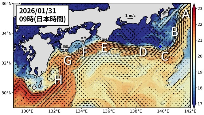 黒潮の沿岸側には、西向き(B)や北西向き(D)の暖水の分岐が見られます。