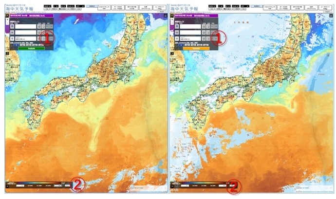 図5はJAXAひまわりモニタ・海中天気予報のサイトで見た、人工衛星「ひまわり」で観測された去年(左)と今年(右)の1月20日の海面水温です。