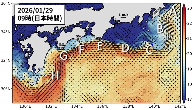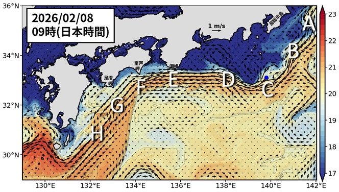 黒潮は八丈島の南から八丈島付近を流れています(図1 C)。 黒潮は房総半島から離れています(B)。潮岬(E)、室戸岬(F)で黒潮が接岸しています。足摺岬では黒潮がやや離れつつあります(図5も参照)