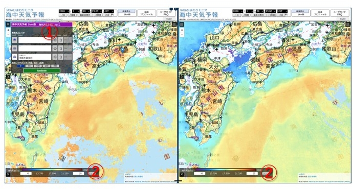 図5はJAXAひまわりモニタ・海中天気予報のサイトで見た、人工衛星「ひまわり」で観測された1月21日と1月28日の海面水温です。