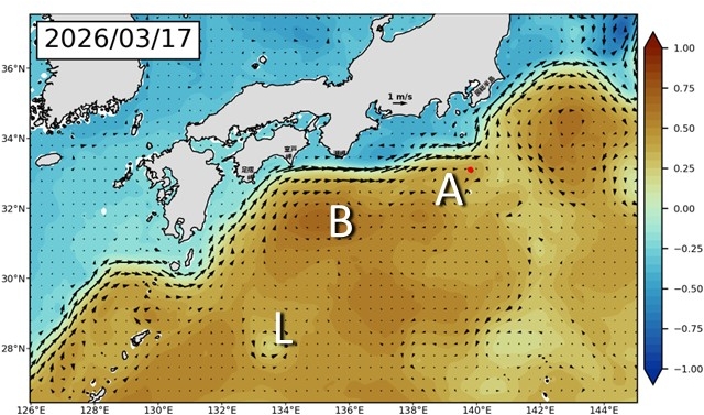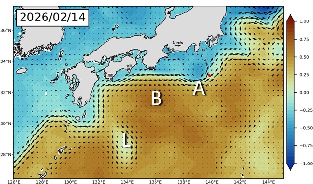 今後の予測のもう一つの注目点は、冷水渦Lです。この渦は西に移動すると予測しています(図1~3)。冷水渦Lがこのまま西に進んで九州南東の黒潮に近づくと、小蛇行を引き出し(図3 C)、黒潮の流れが変化するきっかけになる可能性があります。しかし、現在のところ、その影響は小さいと予測されています。