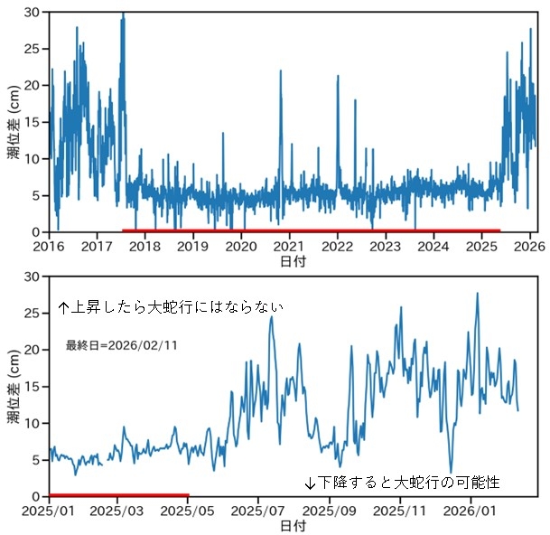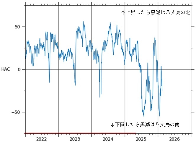 八丈島の南を黒潮が通ると、八丈島の潮位が下がることが知られています(「黒潮が八丈島の南を流れているのをどうやって観測で確認するの?」参照)。潮位は下降して、八丈島の南を流れていることを示していました。直近では上昇してグラフの0の下あたりを上下しています。黒潮が八丈島付近を流れていることを示しています。予測通りであれば、今後は値がいったん上昇します。