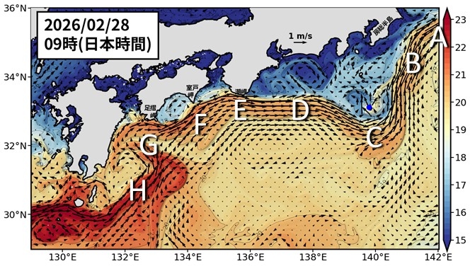 黒潮は八丈島付近をやや南に流れています(図1 C)。 房総半島からは離れています。潮岬(E)、室戸岬(F)、足摺岬(G)で黒潮が接岸しています(図5も参照)。