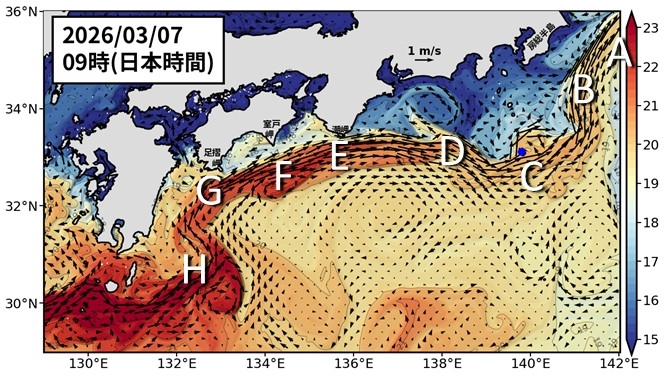 黒潮は八丈島付近をやや南に流れています(図1 C)。 房総半島からは離れています。潮岬(E)、室戸岬(F)、足摺岬(G)で黒潮が接岸しています。九州南東では小蛇行が見られます(H, 図5も参照)。