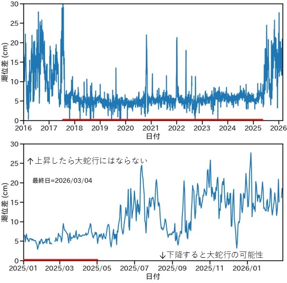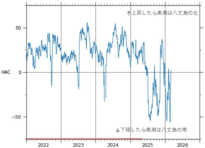 八丈島の南を黒潮が通ると、八丈島の潮位が下がることが知られています(「黒潮が八丈島の南を流れているのをどうやって観測で確認するの?」参照)。直近では潮位が下降して、黒潮が八丈島の南を流れていることを示していましたが、上昇に転じています。予測通りであれば、今後は値がさらに上昇します。