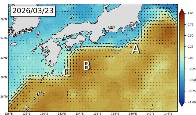今後の予測のもう一つの注目点は九州東の小蛇行(図1 C)です。これが成長した場合、黒潮の流れが変化するきっかけになる可能性があります。しかし、発達はしないと予測しています(図2〜3)。