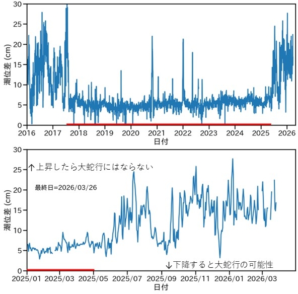 黒潮大蛇行の特徴の一つは、黒潮が潮岬から離れていることです。黒潮が潮岬から離れているかを観測で見る良い方法として、串本と浦神の潮位差を見るという方法が知られています(「潮岬への黒潮接岸判定法は?: 串本・浦神の潮位差」参照)。黒潮が紀伊半島に近づくと潮位差は大きくなり、黒潮が紀伊半島から離れると潮位差は小さくなります。現在、潮位差が比較的大きいことは、黒潮が接岸していることを示唆しています。予測通りであれば、このまま高い値が続きます。