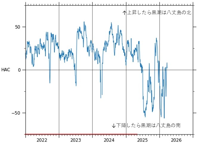 八丈島の南を黒潮が通ると、八丈島の潮位が下がることが知られています(「黒潮が八丈島の南を流れているのをどうやって観測で確認するの?」参照)。直近では0の値近くで振動しており、八丈島付近を南北に動いていることがわかります。予測が正しければ、しばらく振動した後に上昇します。