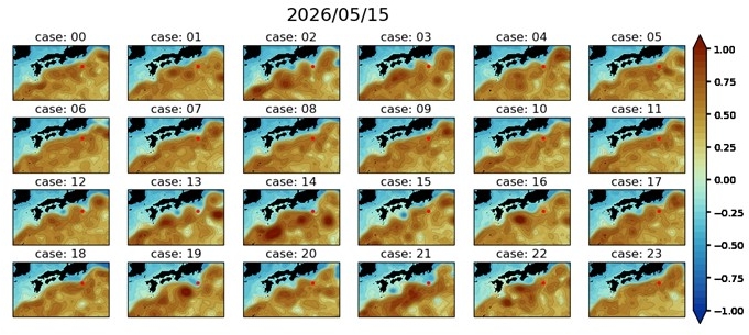 JCOPEでは、上記の予測の他に、予測初期の条件を変えて予測値がどれくらいの幅で変わるかという予測実験も行っています(JCOPE3Fによるアンサンブル予測)。下の参考図は2か月先の黒潮の予測です。全24通りの予測を実施しています。図3のような状況を反映して、黒潮が八丈島(●)の近くから北寄りに流れる予測が多くなっています。図1~3で注目している小蛇行Cが大きく発達する予測はほとんどありませんが、大きめの蛇行になっている予測もあります(case 12, 13, 15, 21など)。