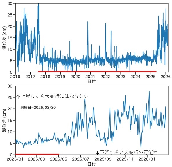 黒潮大蛇行の特徴の一つは、黒潮が潮岬から離れていることです。黒潮が潮岬から離れているかを観測で見る良い方法として、串本と浦神の潮位差を見るという方法が知られています(「潮岬への黒潮接岸判定法は?: 串本・浦神の潮位差」参照)。黒潮が紀伊半島に近づくと潮位差は大きくなり、黒潮が紀伊半島から離れると潮位差は小さくなります。現在、潮位差が比較的大きいことは、黒潮が接岸していることを示唆しています。予測通りであれば、このまま高い値が続きます。