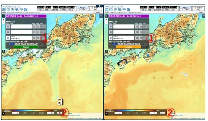 図5はJAXAひまわりモニタ(本体)で見た、人工衛星「ひまわり」で観測された昨年と今年の4月28日の水温の比較です。