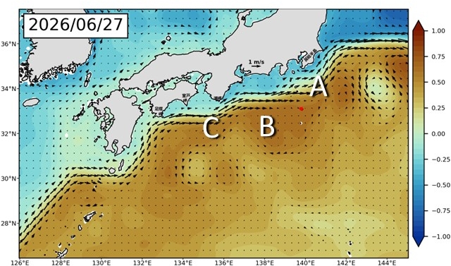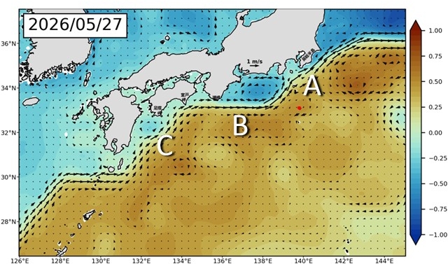今後の予測のもう一つの注目点は九州東方の小蛇行(図1 C)です。これが成長した場合、黒潮の蛇行が大きくなるきっかけになる可能性があります。しかし、あまり発達しないと予測しています(図2〜3) 。