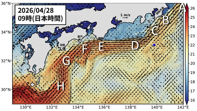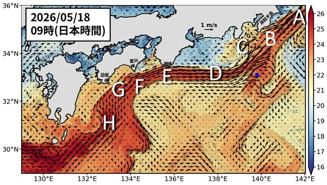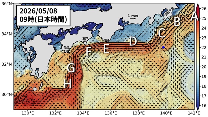 黒潮は八丈島付近の北を流れています(C, 図1)。 房総半島に黒潮が近づいています(B)。潮岬(E)、室戸岬(F)、足摺岬(G)で黒潮が接岸しています。九州南東では小蛇行が見られます(H, 図5も参照)。