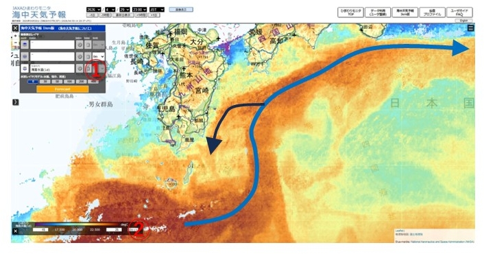 水温から、九州南東で黒潮本流(青線)が小蛇行(離岸)していることがうかがえます。分岐流が反時計回りに流れている様子も見られます(黒線)。