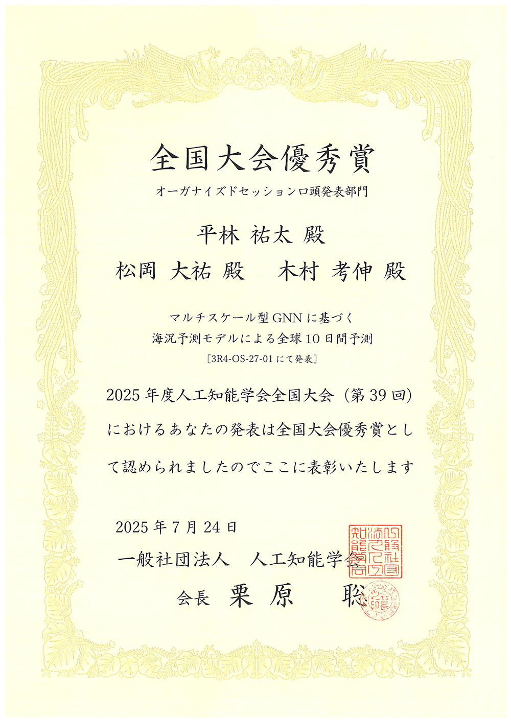 この賞は、人工知能学会全国大会で発表された研究のうち、学術・技術的な貢献や新規性・有用性が特に優れた発表を行った研究者に授与される賞です。