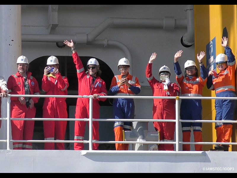 「ちきゅう」は海底に設置していた定点保持に使う音響機器の回収を終え、清水港に向けて航走を開始しました。船上と陸上で平日毎朝行っていたミーティングも JTRACK の全作業が完了したことからこの日が最終回。通常はco-chiefだけが出席していますが、今回はサプライズで乗船研究者が全員出席し、陸上にいる航海関係者への感謝がたくさん伝えられました。近づく別れを惜しんでハグする研究者の姿があるなど、航海の終了に向けていよいよカウントダウン開始です。